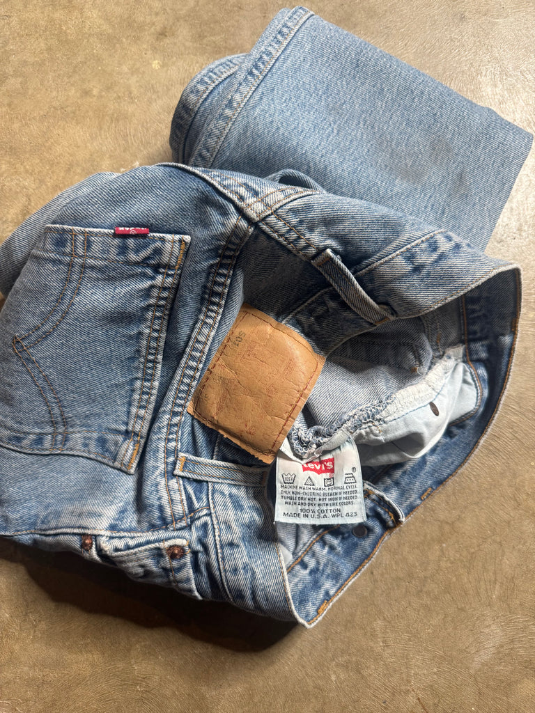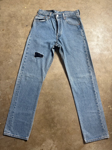 Vintage Levi’s 501 Jeans. Tag reads “W29 L30”. Made in USA. Mid Rise/ Slim Fit/ Straight Leg/ Button Closure. 100% cotton + non stretch vintage denim (size up if it’s your first time buying vintage). Best fit for a 27” waist depending on desired fit. No try ons! Please refer to measurements below. Please note pairs are atleast 20 years old and may have signs of wear.
