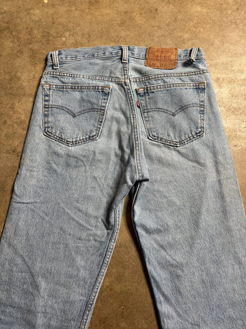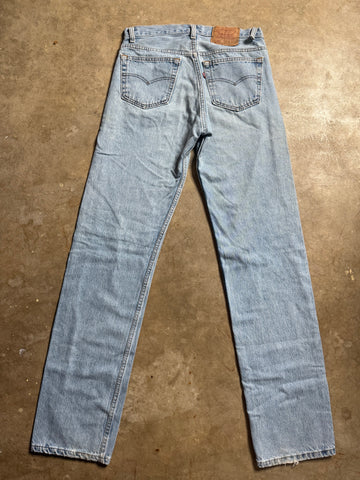 Vintage Levi’s 501 Jeans. Tag reads “W32 L36”. Made in USA. Mid Rise/ Slim Fit/ Straight Leg/ Button Closure. 100% cotton + non stretch vintage denim (size up if it’s your first time buying vintage). Best fit for a 31” waist depending on desired fit. No try ons! Please refer to measurements below. Please note pairs are atleast 20 years old and may have signs of wear.
