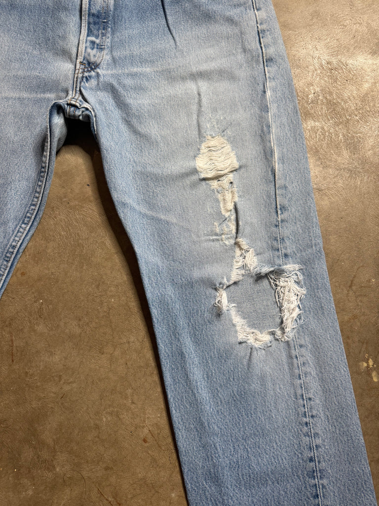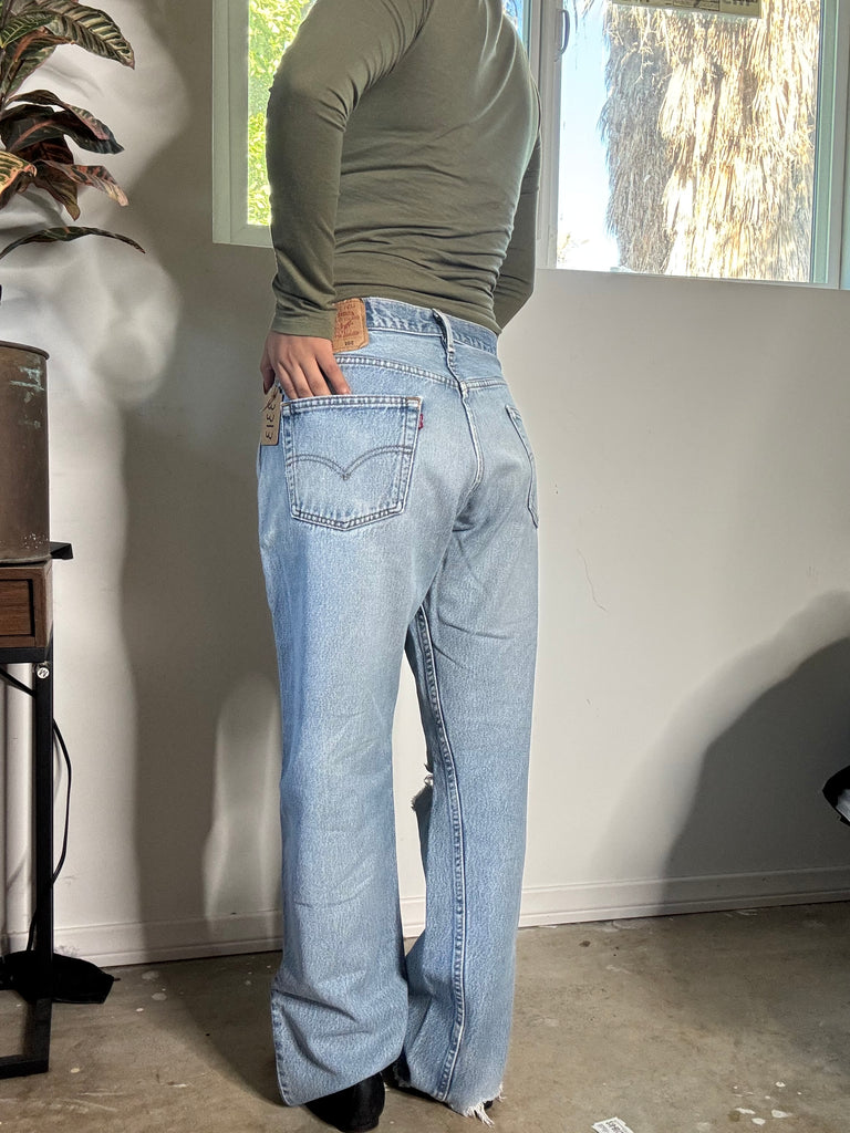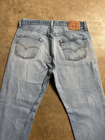 Vintage Levi’s 501 Jeans. Tag reads “W36 L30”. Made in USA. Mid Rise/ Slim Fit/ Straight Leg/ Button Closure. 100% cotton + non stretch vintage denim (size up if it’s your first time buying vintage). Best fit for a 33” waist depending on desired fit. No try ons! Please refer to measurements below. Please note pairs are atleast 20 years old and may have signs of wear.