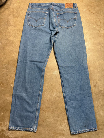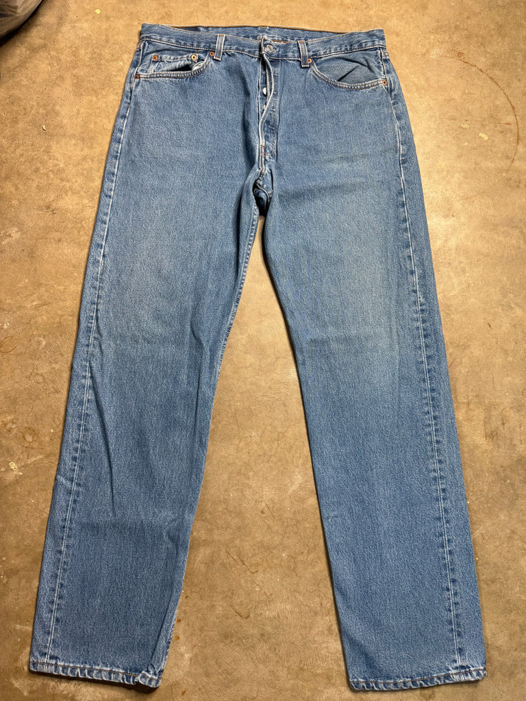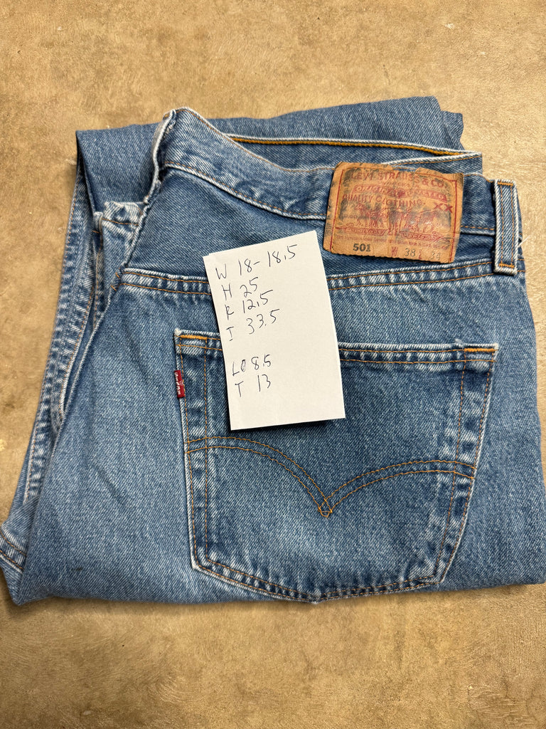 Vintage Levi’s 501 Jeans. Tag reads “W38 L34”. Made in USA. Mid Rise/ Slim Fit/ Straight Leg/ Button Closure. 100% cotton + non stretch vintage denim (size up if it’s your first time buying vintage). Best fit for a 36/37” waist depending on desired fit. No try ons! Please refer to measurements below. Please note pairs are atleast 20 years old and may have signs of wear.