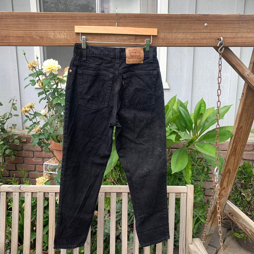 Black Vintage 1990’s 550 Levi’s Jeans. Tag reads “11”. Made in USA. Highwaisted/ Relaxed Fit/ Tapered Leg/ Zipper Closure. 100% cotton + non stretch vintage denim (size up if it’s your first time buying vintage). Best fit for a 29/30” waist depending on desired fit. No try ons! Please refer to measurements below. Please note pairs are atleast 20 years old and may have signs of wear.