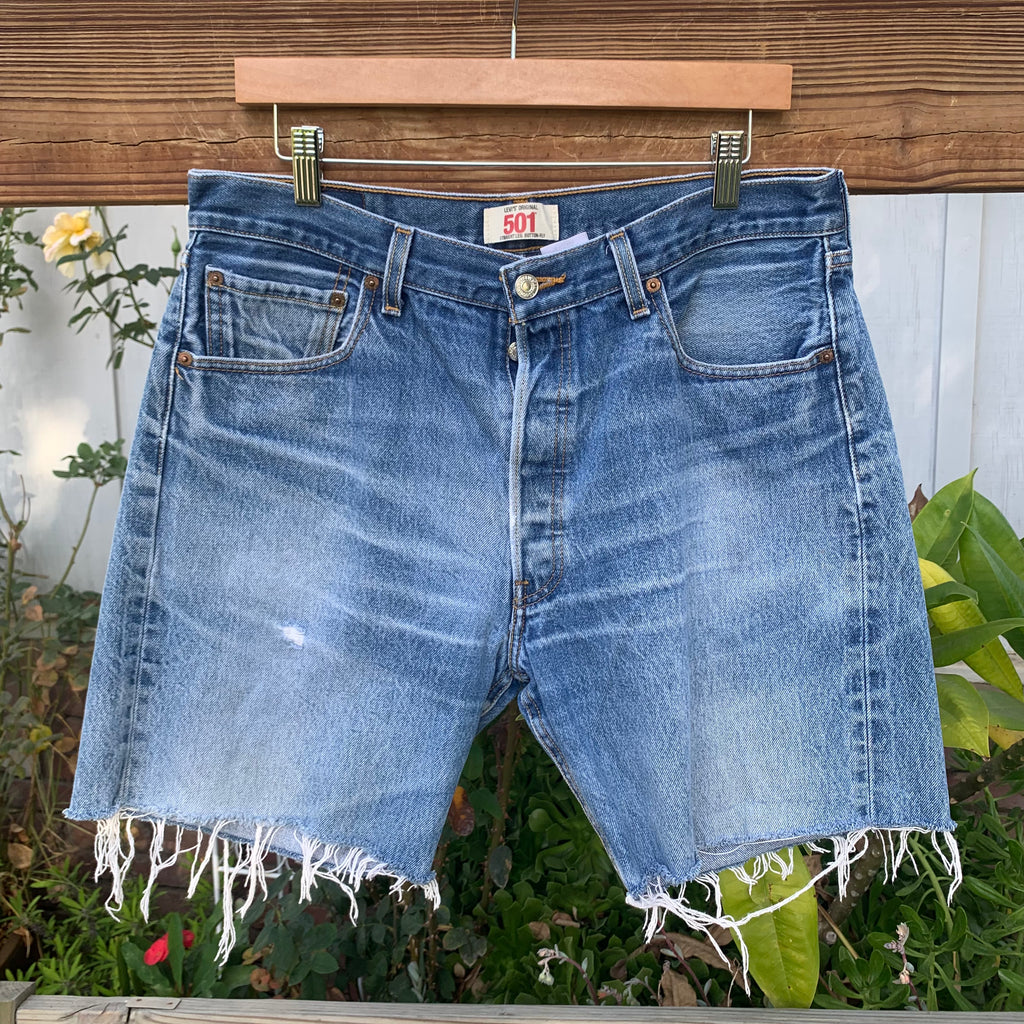 Early Y2K 501 Levi’s Cutoff Shorts. Mid Rise/ Slim Fit/ Button Closure. 100% cotton + non stretch vintage denim (size up if it’s your first time buying vintage). Best fit for a 33/34” waist depending on desired fit. No try ons! Please refer to measurements below. Please note pairs are atleast 20 years old and may have signs of wear.